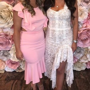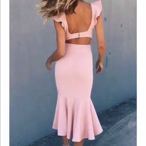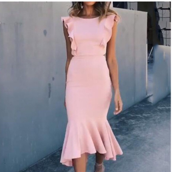 BRAND NEW! Pink high neck dress. Sleeveless with ruffles on arms and bottom. Semi open back. See picture. Perfect for your next event!