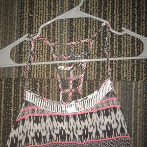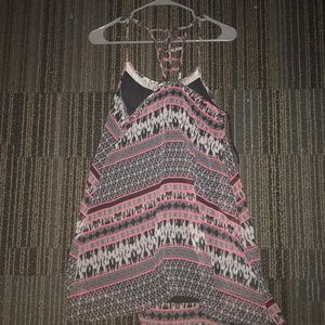 Silky material, with a ladder like strap on the back. Ends just above the knee & is a spaghetti strap