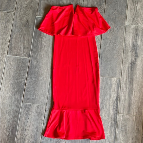 This is a beautiful red ruffle strapless midi dress.