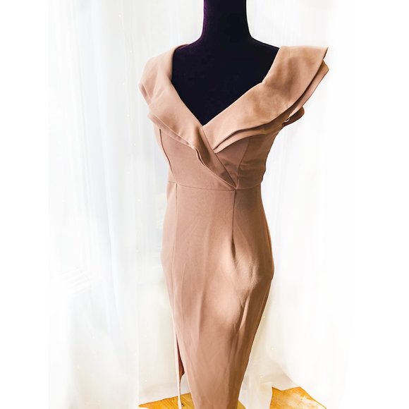 This elegant dress that can be worn on shoulder or off-shoulder. Ruffle trimming and figure-hugging silhouette. with slit in the front and zipper in the back. Brand new, never worn.