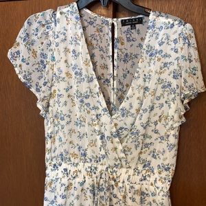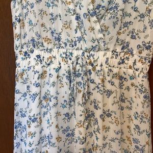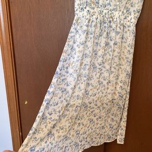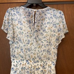 Super cute midi dress! Blue and yellow flowers on a white dress, lining in the dress, sheer elsewhere. Fluttery sleeves. The top is a bit looser and flowy with v neck. Stretchy waistband. Worn once!