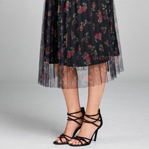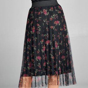 Ladies fashion elastic waist band w/accordian pleated floral print mesh midi skirt