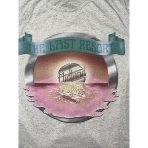 Midland The Last Resort graphic tee featuring a retro-style sunset design and banner text. Soft, lightweight cotton with a slightly worn-in feel for that perfect vintage look. Great for fans of country music or collectors of band tees.