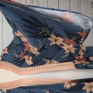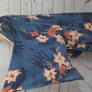 Floral print adorns this fabulous hi-lo hem kimono. Background color is a softly muted aegean blue with a contrasted pink hibiscus print, with a silky apricot colored shawl collar. Fit on this style is true to size. Long, flowy, traditional kimono sleeves. Imperfections :tiny, scratch like mark on collar, as shown. Slight fabric pulls on the back of the kimono, and small, darker colored stain on left kimono sleeve. All three indicated with pointer. Due to the billowy nature and graceful flow of the fabric, these are barely noticeable. Bonus! If you're a General Hospital fan, the lovely Anna Devane wore it on an episode in 2018. Elegant piece to add to your nightgown rotation.