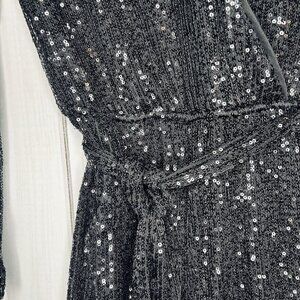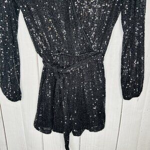 Midnight Doll Black Full Sequin Shorts Romper Tie Waist Sz XS Long Sleeve, 95% polyester, 5% spandex. This romper is in excellent condition. It has a deep v-neckline with a hidden snap closure at the chest. It also has a tie sash.
