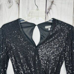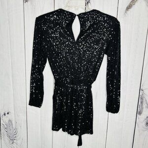 Midnight Doll Black Full Sequin Shorts Romper Tie Waist Sz XS Long Sleeve