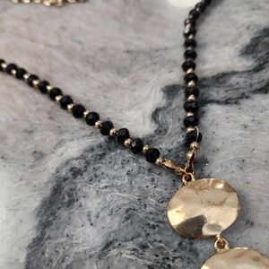This stunning necklace exudes timeless sophistication with its deep black beads paired with lustrous gold discs. The hammered texture on the discs adds a touch of rustic charm, making this piece a versatile addition to both casual and formal outfits.