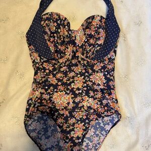 Midnight Grace One Piece Swimsuit – Size 36G, Vintage-Inspired Floral Halter