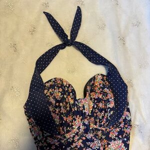 Tags: retro swimwear, pinup swimsuit, halter one piece, full bust swimsuit, supportive swimwear, vintage floral swimsuit, curvy fit swimwear, underwire swimsuit, plus size swimwear, chic beachwear, poolside style, polka dot swimsuit, classic one piece