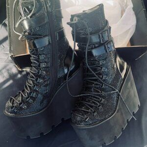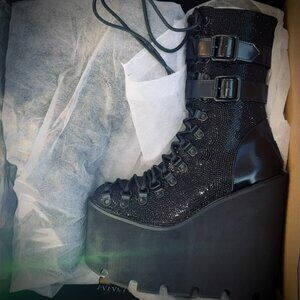 Dolls Kill/ Club Exx Black crystal/rhinestone lace-up platform boots. Brand new, in box, never worn. US size 6 fits like a 5, size 7 fits a size 6, comfortably. These sizes are currently sold out online. Originally got my usual (size 6), and by the time I even tried them on I had missed the return window; later bought the next size up. I love these boots so much that I'll never wear them; both pairs have been sitting in their boxes on my shoe rack (smoke-free home). Listed price $158.