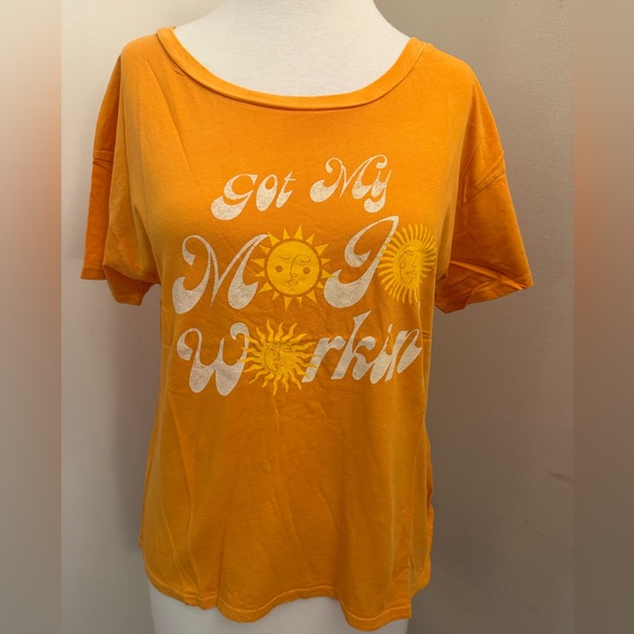 Got My Mojo Workin orange tee with sun graphic. Scoop neck can be worn on or off shoulder. Loose fit.