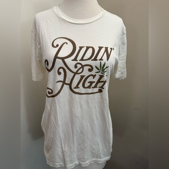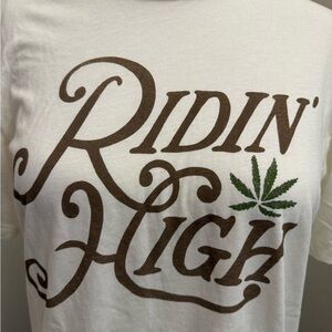 Super soft tee featuring 'Ridin' High' in brown print.
