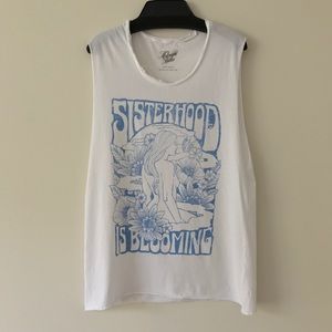 Sisterhood is blooming! This 70s inspired tee by Midnight Rider features a screen print graphic on the front, muscle tank cut, and relaxed body style. New without tags. The neckline has a worn look as shown in the last picture.
