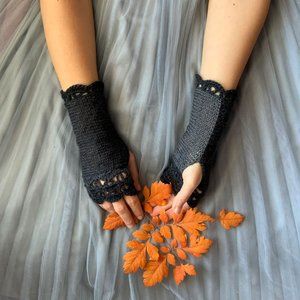 Elegant fingerless gloves are knitted & crochet in luxurious light weight wool/acrylic yarn.