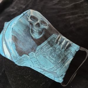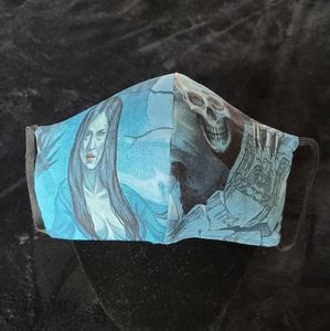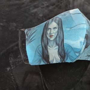 Alexander Henry Midnight Shadows mask by Kai's Corner. Featuring elastic over the ear loops and a dark blue inside fabric, these ear loops are smaller making it a better fit for petite faces.