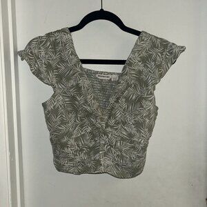 Midnight Sky Green Tropical Palm Linen Blend V-Neck Crop Top Size Large