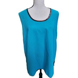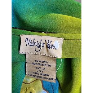The Midnight Velvet 2 Piece Jacket/Tank set in Plus Size 1X is a stylish and versatile outfit for women. The embellishments on the chiffon fabric give it a bohemian, tropical feel perfect for casual occasions. The round neckline, pullover closure, and long sleeves make it a comfortable and breathable option for all seasons. The blue floral pattern adds a touch of femininity, while the lightweight polyester material ensures a comfortable fit. With its contrasting trim and bohemian theme, this set from Midnight Velvet is sure to become a staple in any woman's wardrobe. CLOTHING AND FABRIC ITEMS: All clothing and fabric items have been steam cleaned and/or washed. Dark area on back of tank, as shown.