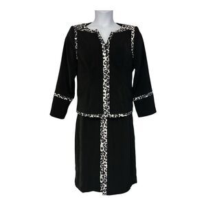 Jacket has faux dickie modesty panel that is only a few inches wide across the front. Silvery white with gray and black satin leopard trim. The jacket is meant to be worn as a top, and has multiple hook and eye closures. Straight skirt is front vented, and has dual elastic tabs for comfort when wearing and a concealed zipper. Fabric is crepe weight, but is not crepe. A very slight bit of stretch for comfort and to hold it's fit, not a stretchy suit. Lined. See photos for content. Machine wash, line dry.