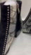 Elegant black boots with striking snake print accents. Studded details add a bold touch. Perfect for a stylish look.