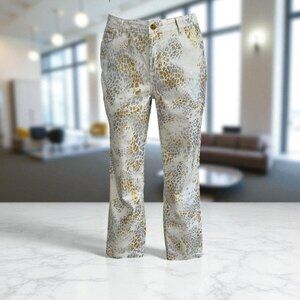 Step into effortless glam with these eye-catching metallic pants from Midnight Velvet, size 18W. Featuring a high-shine gold and silver abstract animal-inspired print, these pants are a statement piece perfect for resort evenings, holiday parties, or elevated everyday style. The flattering straight-leg silhouette and mid-rise fit offer comfort and structure, while the cotton-poly-spandex blend gives just the right amount of stretch.