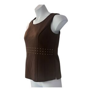 Matte brown, mid-weight, smooth scuba knit fabric is very stretchy. Jacket and cami have stud details, pant does not. Open front, collarless jacket is just below mid hip length but not butt covering on average height. Cami has figure flattering princess seams. Flat front, pull on pant has back elastic waistband. Hand wash jacket and cami, machine wash pant. Unlined. 95% polyester / 5% spandex.