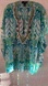 A stunning beaded caftan top, perfect for adding a touch of bohemian flair to your wardrobe. This sheer, lightweight cover-up features an eye-catching abstract pattern in shades of turquoise, green, and white. The V-neckline is beautifully embellished with intricate beadwork, adding a touch of elegance and sophistication. The loose, flowing silhouette provides a comfortable and relaxed fit, making it ideal for warm weather. Drawstring at waist. Perfect for wearing as a beach cover-up, lounging by the pool, or adding a stylish layer to your favorite outfit.