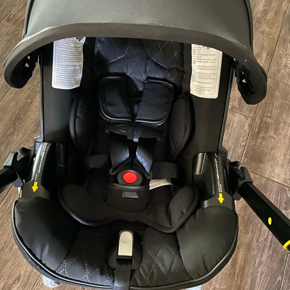 Used like new. Includes stroller and car seat base. Doona attachable diaper bag , leather handle stroller. And new born attachments.