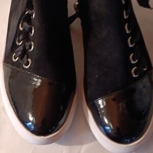 All manmade, these sneakers have a high cute quotient. Suede uppers with a patent toe. Whitewalls. There is a slight lavender blush on the whitewalI, I dont think it will bother you. See photos. Inside zip, outside satin laces. Size 8.5 measures 10.25 long, 3 5/8 wide. Comfy and cool.