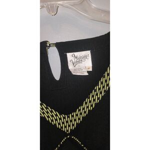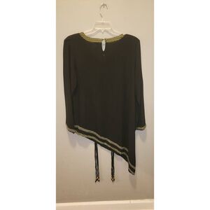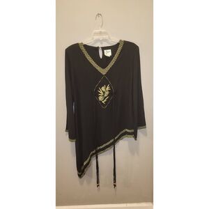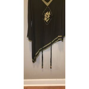 Black tunic has asymmetrical hemline and center embroidery with elongated tassels