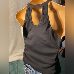 Black 2x1 ribbed tank with upper back cut out with bike and wings graphic