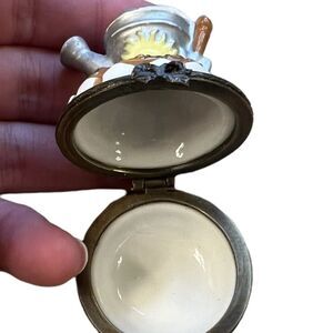 A little over 2” this mini hinged lid trinket box is so adorable and has a garden on top with a watering can, shovel, fence , flowers on top.