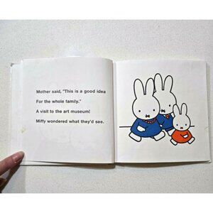 Miffy and her parents go to an art gallery. Father Bunny thinks that Miffy is too small: 'too small, said miffy, no I'm not/I'm really big and tall!' So Miffy is allowed to go to the art gallery too which is very exciting. Miffy sees paintings, a mobile and even a stone statue. Miffy decides she wants to be an artist when she's grown up.