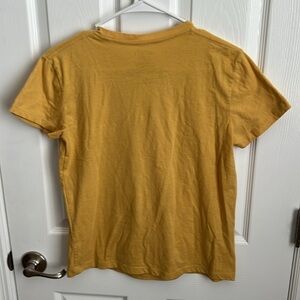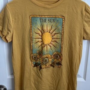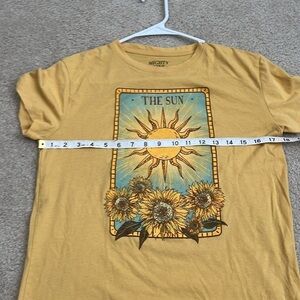 Eye-catching graphic tee featuring a vibrant design with a sun and sunflower motif. This short-sleeve top has a classic crew neckline and a comfortable fit. The design is printed on a soft, golden-yellow fabric, making it a standout piece for casual wear. Pre-owned condition, see all photos for wear and measurements. Smoke and pet free home.