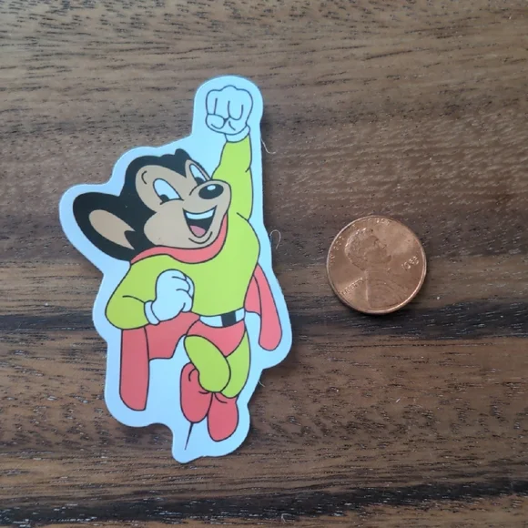 Vibrant Mighty Mouse sticker. Perfect for decorating laptops or notebooks. Fun and nostalgic design.