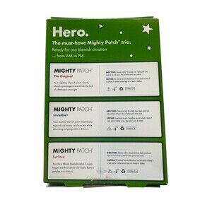 Mighty Patch Hero All-Stars Patch Kit 50 patch set. Includes 24 Hydrocolloid Original Patches, 24 Hydrocolloid Invisible+ Patches & 2 Hydrocolloid Surface Patches. New in box, seal on box is broken but contents inside are in perfect condition. Expires 04-21-2027. Stored in a smoke-free environment.