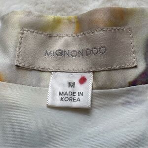 Mignon Duo Floral Pollinated MIDI Skirt Size Medium. Excellent used condition. Watercolor floral design. Polyester satin fabric. D ring belt. Back zipper closure. White lining. Measures waist 30", length 30".