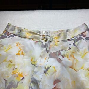Mignon Duo Floral Pollinated MIDI Skirt Size Medium. Excellent used condition. Watercolor floral design. Polyester satin fabric. D ring belt. Back zipper closure. White lining. Measures waist 30", length 30".