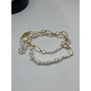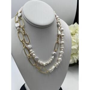Elegant necklace with gold chain links and white pearls. Perfect for any occasion.