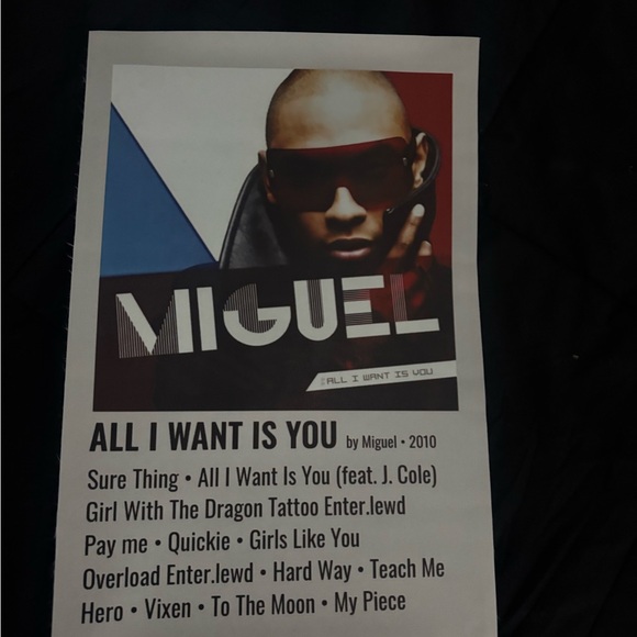 Miguel concert poster featuring album details and tracklist. Bold design with red, black, and white colors.