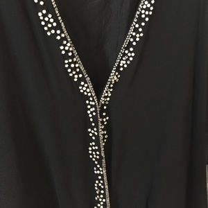 Miguelina sheer blouse. Black. Front is lined with rhinestones. Ties at waist. Deep v neck with hook and eye closure.