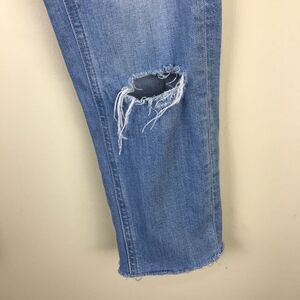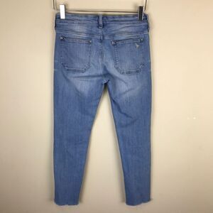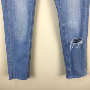 Real cute and easy to wear! Light wash denim, stretchy and very comfortable. Intentional distressed hole and raw edge hem line. Gently preowned with no flaws. Size 27.