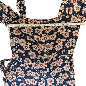 M.i.h. Jeans 100% Silk Elodie All In One Jumpsuit Blue White Red Floral Size Medium. Excellent condition. Shoulder straps and off shoulder ruffle, pockets, button front, wide leg. Short sleeves. Square neckline. Exposed front button down closure. Pockets. Bold blooms and polka dots put a retro spin on this M.i.h. Jeans jumpsuit that highlights your shoulders. See photos for details and measurements. Shop my closet to combine and bundle other items for one shipping charge! Perfect for graduation, vacation, wedding, spring, summer, date night, cruisewear, beach, trip, july 4th, red white and blue, patriotic