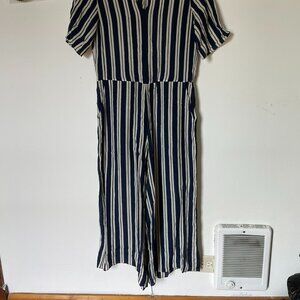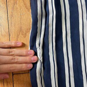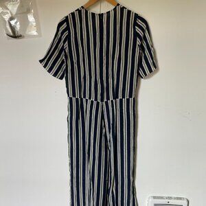 Flowing silk romper in flattering pinstripes of navy blue and white. Invisible zip closure in the back. There is a repair made near the bottom hem of one pantleg, pictured.