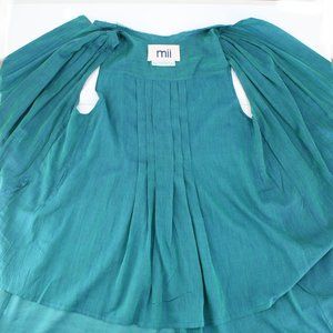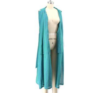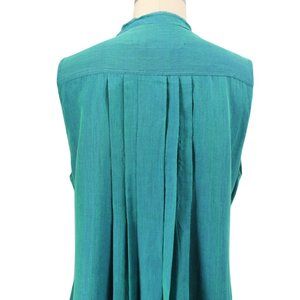 Sleeveless Grecian silhouette wrap dress. Fabric is hand woven. It takes 24 hours to weave just one dress! It is in blue and green making this a beautiful teal. The lightweight silk cotton blend gets more and more iridescent the more it wrinkles. The belt goes through two welted slits at the sides and ties at the waist to give you a slim shape in the front and a mystery in the back. Pleated back cascades away from the body. Standing raw edge collar. Lapels can be worn up or down. Partially lined.