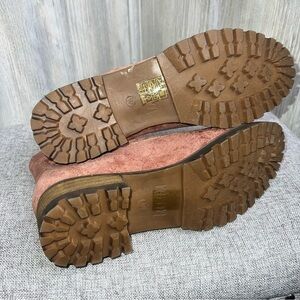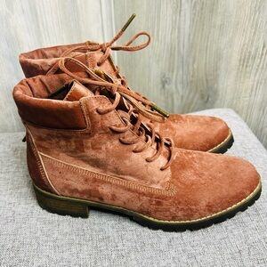 Step out in style with these chic peach colored velvet lace-up boots. Perfect for any casual outing, these Heeled Combat Style Boots offer both comfort and fashion.