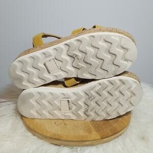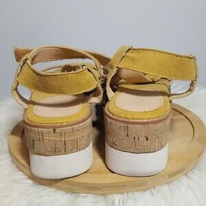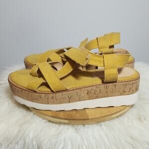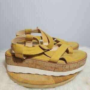 Mi,im Mustard Yellow Strappy Platform Cork Heel Sandals in excellent condition. Minor signs of wear