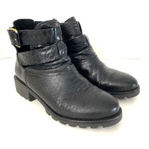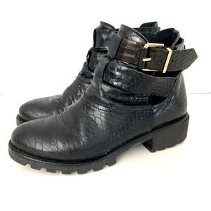 Miista Croc Embossed Ankle Boot Black Leather Round Toe Gold Buckle 37 6.5