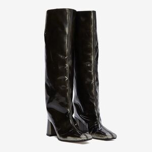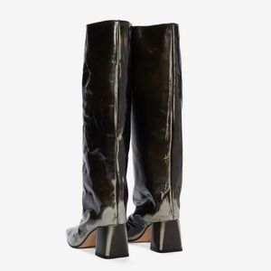 Tall and imposing, Finola is a knee-high, wide-leg boot crafted from patent calf leather that transitions from glossy dark grey leather to light grey revealed via brushing the leather towards the sole. Featuring a block heel and elongated toe, Finola is finished with memory foam insoles, calf leather lining, and leather outsoles.