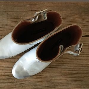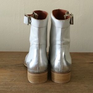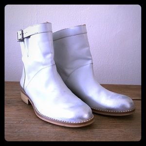 London hipsters die for Miista. Designed in Hackney, London, made in Spain, up for sale is a brand new pair of white and silver genuine leather boots by Miista. The undertone of these boots are silver, and it is revealed in areas where the white color has been "distressed" by the designer. Never worn, retail sticker still on bottom of soles. Would look great with mini skirt!
