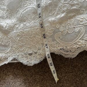 The measurements are approximately 13.5 inches across the shoulders, 15 inches across the bust, 11.5-12 inches across the waist, and the length of the dress is about 58.5 inches from top of the shoulder to the bottom of the lace.